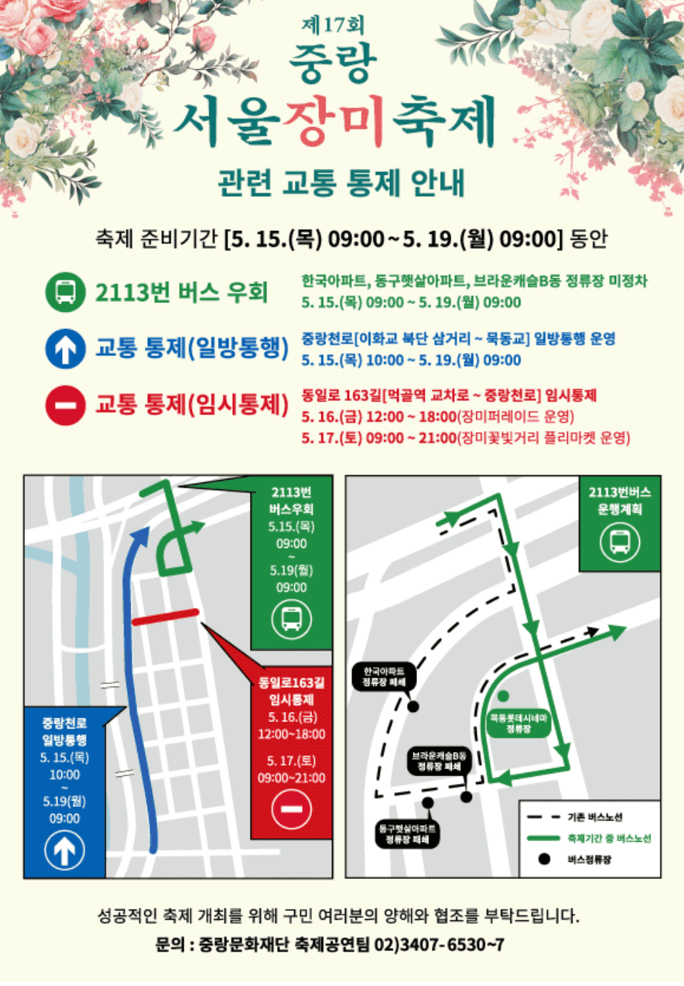 축제 기간 동안 일부 도로에서는 교통이 임시 통제되므로, 우회가 필요할 수 있습니다. 211번 버스는 우회 운행되니 참고해주세요! 🚧